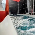 Studio Chic N2 Avec Jacuzzi har ett badrum med badlakan och handdukar. Det finns också ett spabadkar, en badtunna och en separat toalett.